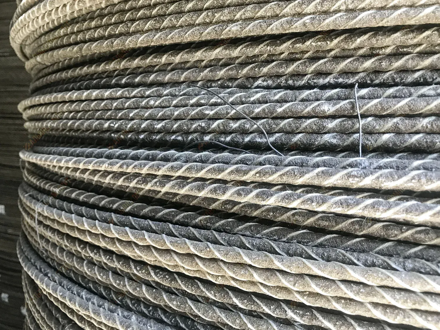 Материал стержня: стеклоровинг. Для уплотнения стеклянных волокон в стержне арматуры жгут стеклопластика перетянут нитью.